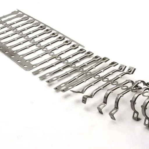Progressive die stamping involves multiple workstations dedicated to distinct operations on a single metal part. This method offers several advantages over similar processes, including rapid setup, impressive production speed, and precise control over the part’s positioning throughout our tool & die stamping services.